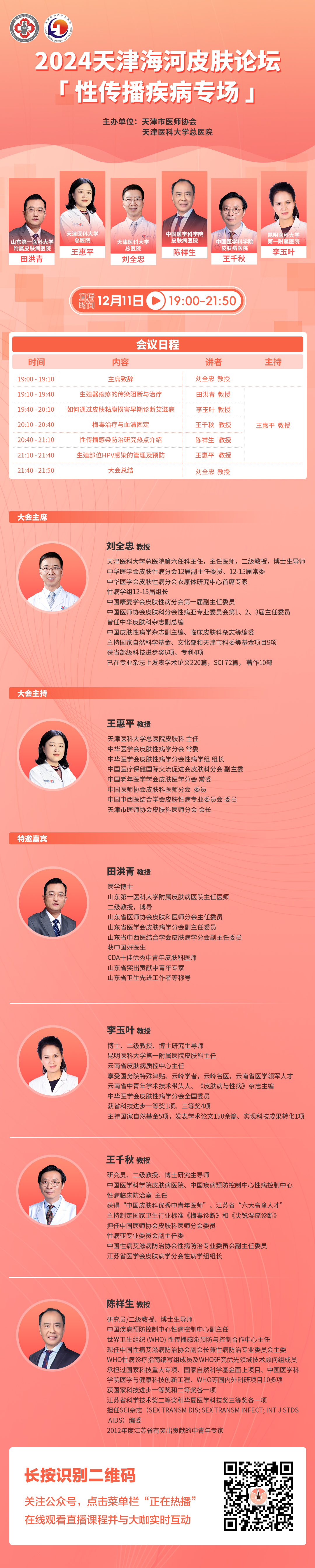 會(huì)議將邀請(qǐng)國(guó)內(nèi)性傳播疾病領(lǐng)域知名專家國(guó)繞性病臨床及基礎(chǔ)研究的熱點(diǎn)進(jìn)行專題演講,內(nèi)容將緊密結(jié)合臨床,兼顧普及與提高為與會(huì)皮膚科醫(yī)師搭建鞏固基礎(chǔ)知識(shí)、提高業(yè)務(wù)技能的平臺(tái)。