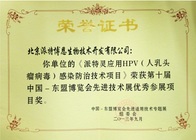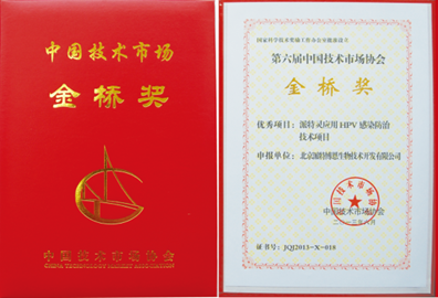 2013年,“派特靈應用HPV感染防治技術(shù)項目”榮獲第六屆金橋獎優(yōu)秀項目獎。