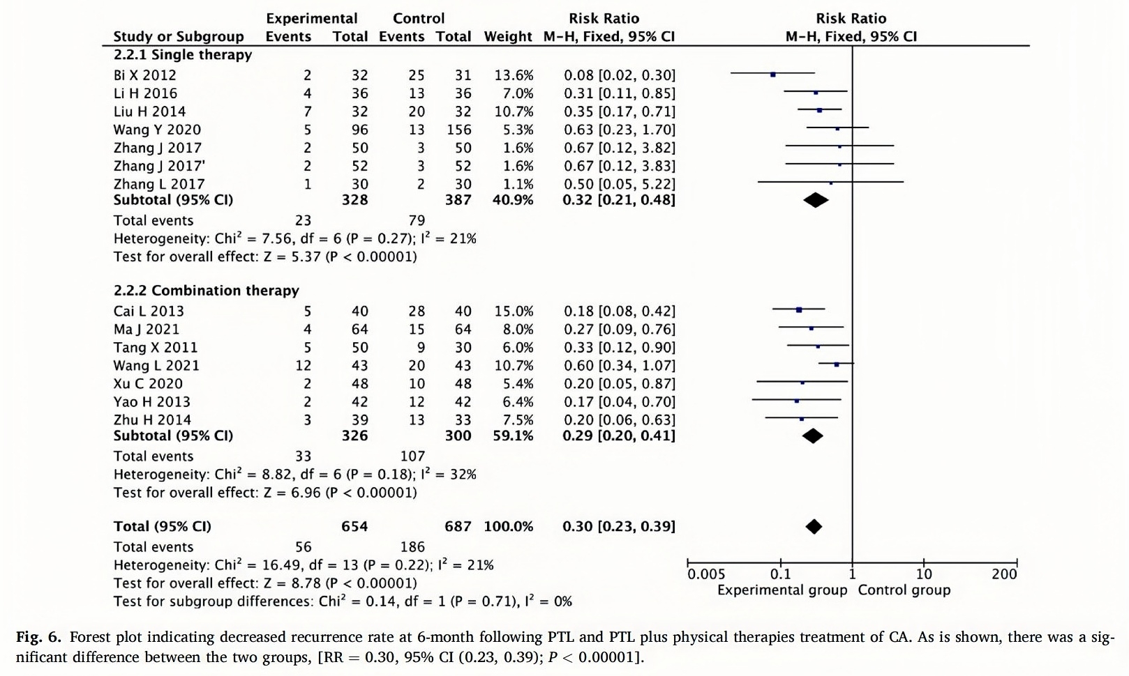In this review,we assessed the efficacy of PTL in patients with CA and included 31 RCTs with 2868 participants.The results demonstrated that PTL was highly influential effective in alleviating CA symptoms,reducing recurrence rates,improving the negative conversion rate of HPV,and regulating immune functions.Although we conducted a prespecified subgroup analysis to examine the effectiveness of PTL,we still found high heterogeneity among the trials.We further performed two subgroup analyses and discovered that the heterogeneity persisted.Through the literature review, we found that the different physical therapies differed somewhat in treatment principles,instrumentation and operating methods in the control group, and we speculated that it might be the other source of heterogeneity.Especially,the highfrequency electrocautery subgroup showed the highest heterogeneity(P<0.0000,I2=94%).We propose two possible reasons for this:one is the limited number of trials included, and the other is that the treatment was different in terms of gender and location of warts between the two trials.