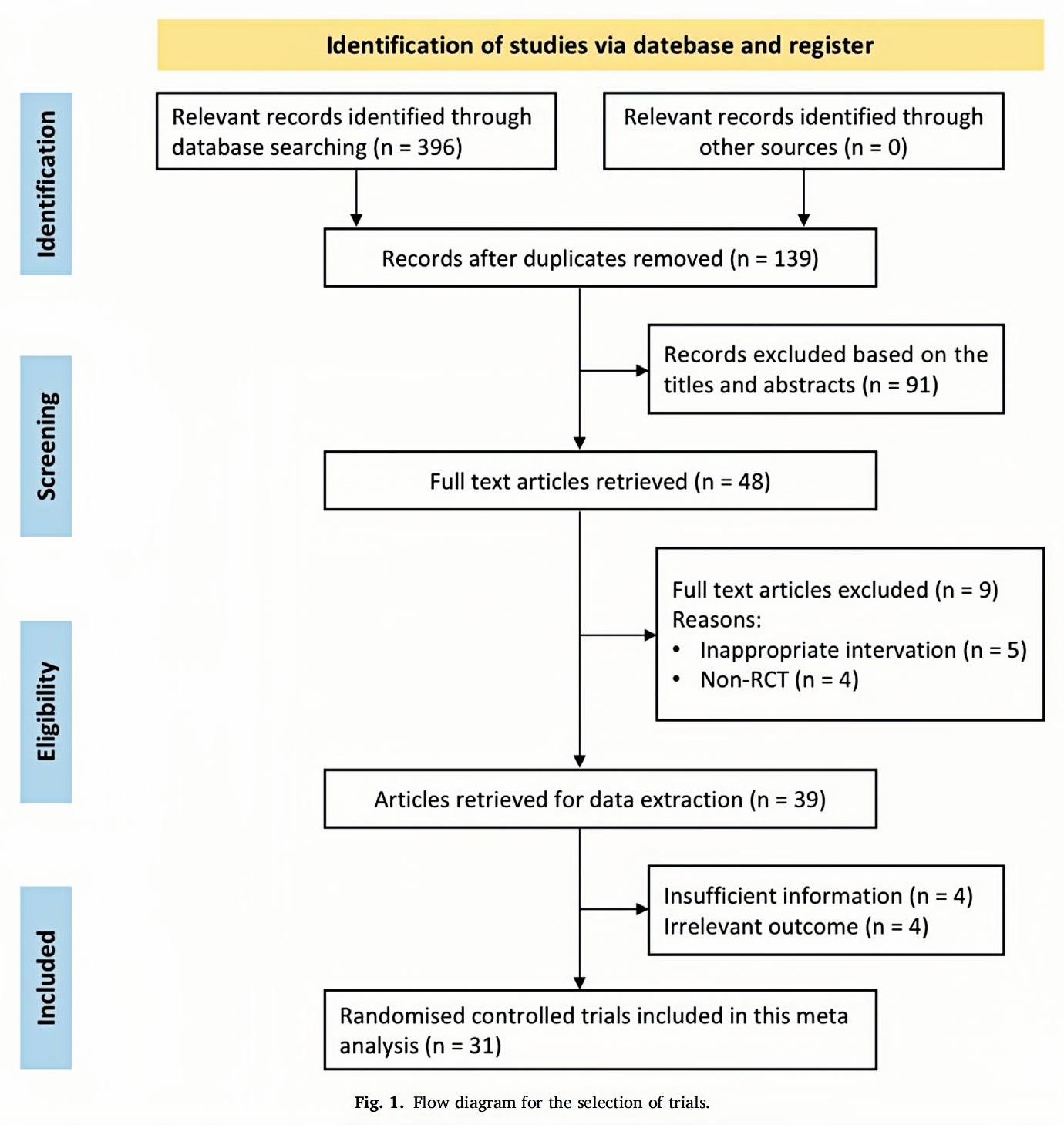 396 eligible studies were identified in our literature search,including 132 from the Wanfang database,114 from CNKI,73 from SinoMed,64 from VIP,5 from MEDLINE,4 from Web of Science,3 from PubMed,1 from Cochrane Library and 0 through manual search of other resources.After excluding 257 duplicates, we performed further selection and deleted 91 based on title and abstract screening.17 studies were then excluded for intervention methods inconsistent with the requirements of this review, non-randomized controlled trials, or inability to obtain the full text. Finally, 31 were included and assessed in the pooled analysis.The process of the literature search is shown in Fig.1.