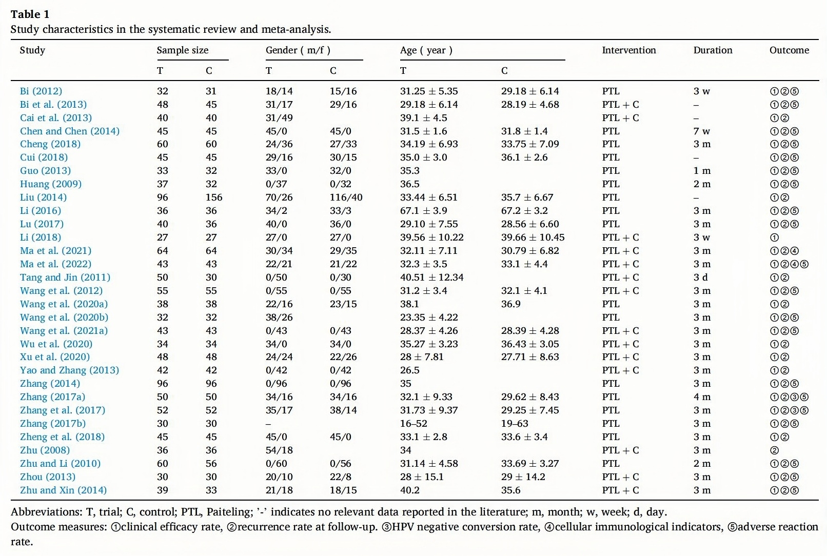 4) Outcomes: The primary outcome was clinical effectiveness,and the secondary outcomes were recurrence rate, the negative conversion rate of HPV and immune cell levels. The incidence of adverse events was chosen as the safety indicator.