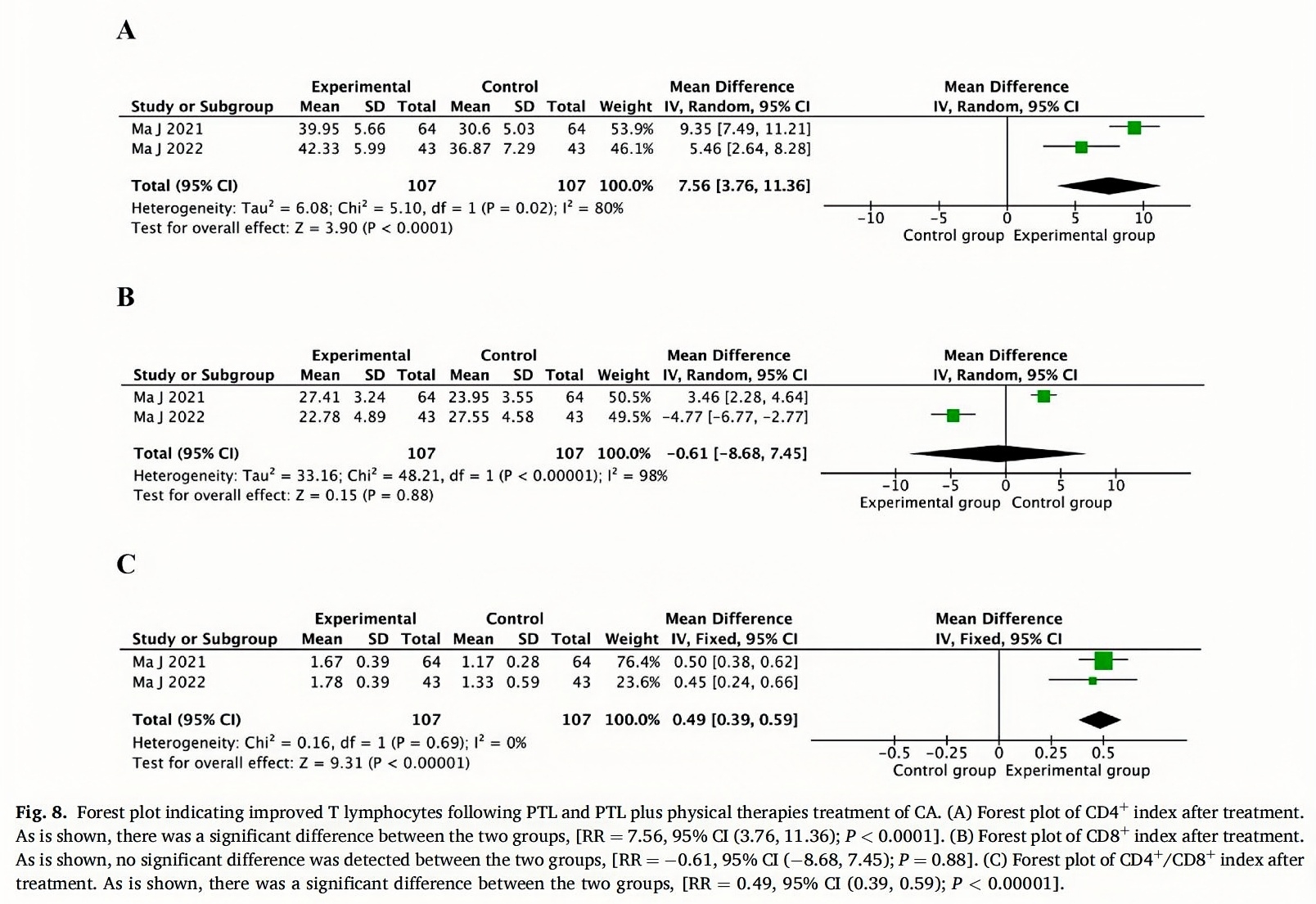 2 studies reported improvement in T-cell subsets CD4+,CD8+ and CD4+/CD8+ ratio(Ma et al.,2021,2022).The heterogeneity test showed that there was significant heterogeneity between them for CD4+ and CD8+ cells(Fig.8A and 8B).Therefore,a random effects model was used for analysis.For the CD4+/CD8+ ratio,there was no significant heterogeneity(P=0.69,I2=0%),so the fixed effects model was used (Fig.8C).The metaanalysis showed that PTL could significantly increase the CD4+ cell levels(MD=7.56,95% CI[3.76,11.36];P<0.0001)and regulate the CD4+/CD8+ ratio(MD=0.49,95% CI[0.39,0.59];P<0.00001). However,CD8+ cells did not appear to improve.Due to the apparent heterogeneity between CD4+ and CD8+ indices,we further reviewed the literature to investigate the heterogeneity between the two studies.We found that one study had a treatment duration of 3 months and another had 9 months,suggesting that the inconsistent duration may be the main cause of the high heterogeneity.