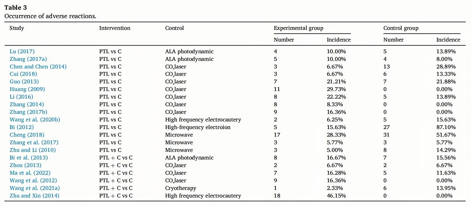 3) Control group:Based onl physical therapy with CO2 laser therapy, aminoketovaleric acid (ALA) photody namic therapy, microwave therapy, high-frequency electrocautery,high-frequency electroion therapy,and cryotherapy.There are no restrictions on which way is chosen regardless of whether recombinant human interferon alpha-2b is added.Therefore,the comparison is set asfollows:(1)single therapy group:PTL versus physical therapies,(2)combination therapy group:PTL plus physical therapies versus physicaltherapies.