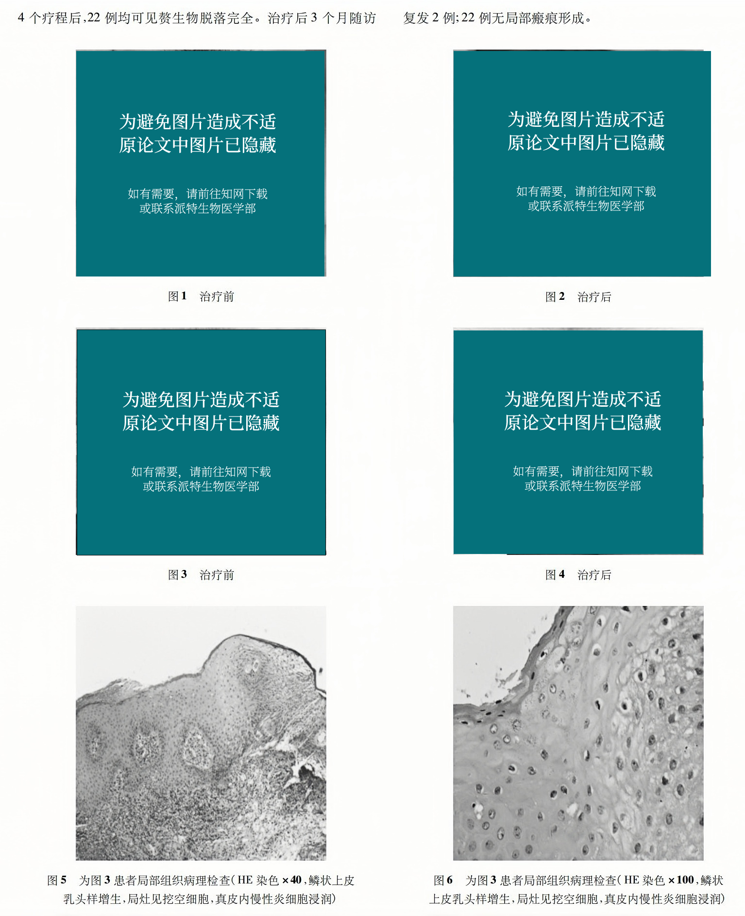 肉眼及醋酸白實驗觀察患者疣體消除,且在治療后3個月內,原疣體部位未復發(fā)。