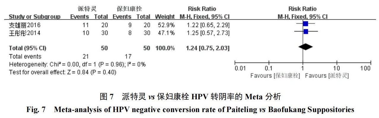 2項研究[19-20]報道了派特靈與保婦康栓的療效對比,采用固定效應模型(I2=0,P=0.96),結(jié)果顯示派特靈組HPV轉(zhuǎn)陰率為42%(21/50),保婦康栓組HPV轉(zhuǎn)陰率為34%(17/50);