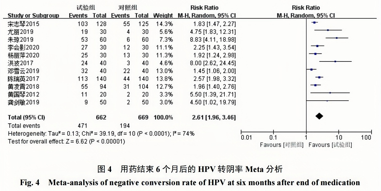 11項研究[6-11,14-18]報道了用藥結(jié)束6個月后的HPV轉(zhuǎn)陰率,采用隨機效應模型(I2=74%,P< 0.0001),結(jié)果顯示派特靈組HPV轉(zhuǎn)陰率為71.19%(471/662),隨訪對照組轉(zhuǎn)陰率為 29.00%(194/669);