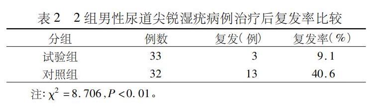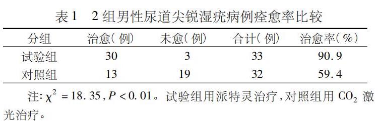 將65例男性尿道尖銳濕疣患者隨機(jī)分成派特靈治療試驗(yàn)組(33例)和CO2激光治療對照組(32例),隨訪3個(gè)月,比較2組的治愈率、復(fù)發(fā)率和不良反應(yīng)。