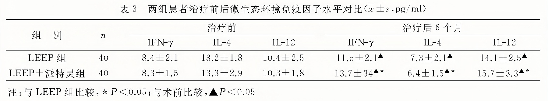 且LEEP+派特靈組IFN-γ和IL-12水平上升和IL-4水平下降幅度相比于LEEP組均有統(tǒng)計學(xué)意義(P<0.05)。